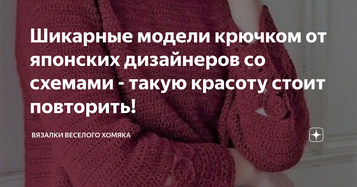 Шикарные модели крючком от японских дизайнеров со схемами - такую красоту стоит повторить! Статья автора «Вязалки Веселого Хомяка» в Дзене ✍: Добрый день, дорогие подписчики и читатели канала! Мира, здоровья и ровных петелек вам!