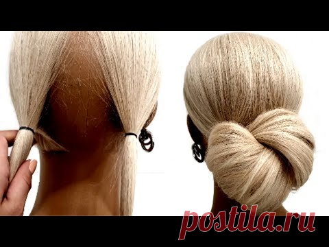 На изображении представлен процесс создания прически с пучком. Слева - женщина собирает светлые волосы в хвост, справа - готовый аккуратный пучок на затылке.