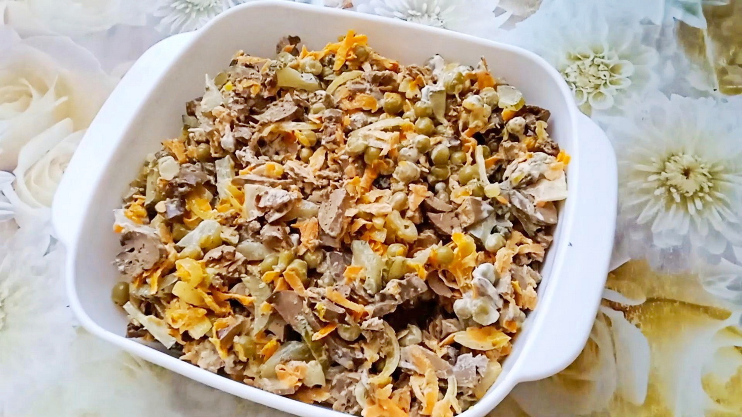 Нежный, сочный и вкусный салат "обжорка". Нежный, сочный и вкусный салат обжорка . Печень очистите от прожилок и частичек жира, помойте. Отварите печень в кипящей подсоленной воде на умеренном огне до готовности в течение 20 минут. Печень должна остаться мягкой, при этом без следов крови (не розовая) внутри). . Предварительно вымытую в проточной воде со щеткой морковь очистите. Натрите морковь на крупной терке.. лук очистите от шелухи, помойте. Нарежьте лук не слишком тонкими…