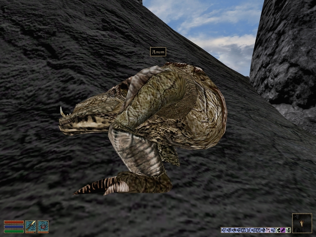 Алит (Alit), несуразное животное Вварденфелла, родственное кагути. Передвигается на своей единственной паре лап на манер утки. Периодически приседает самым неприличным образом. Отсутствие хвоста компенсирует с другой стороны длинной мордой с выступающей нижней челюстью. Несмотря на размеры головы туповат. Однажды, помнится, долго пытался прокусить магический кокон от заклинания Щит на нашей Эбонитовой кольчуге. И вертикальным хватом челюстей грыз, и горизонтальным. А потом брык – завалился на бо