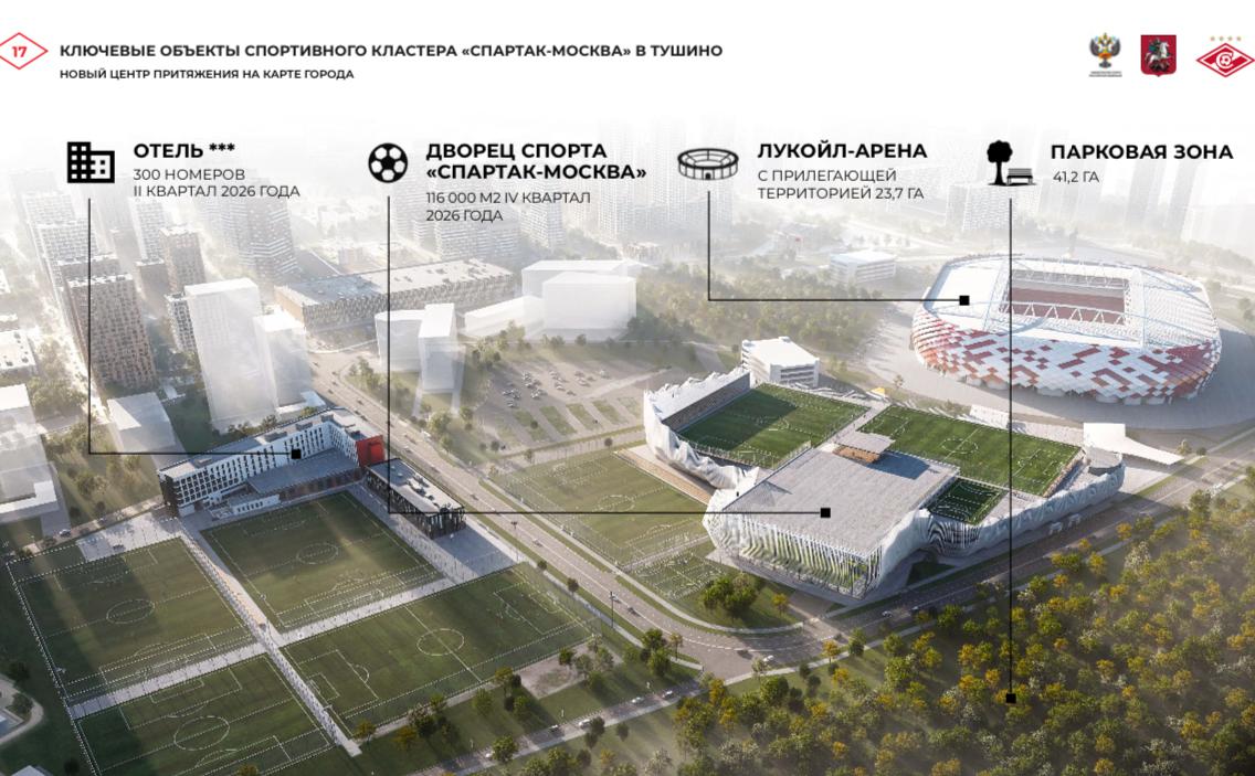 «Спартак» показал проект нового Дворца спорта в Тушино. В комплексе общей площадью 110 тыс. кв. м в том числе разместятся полноформатный крытый манеж, три футбольных поля, два из которых — на крыше дворца. Объект будет построен рядом с «ЛУКОЙЛ-Ареной», домашним стадионом «красно-белых»