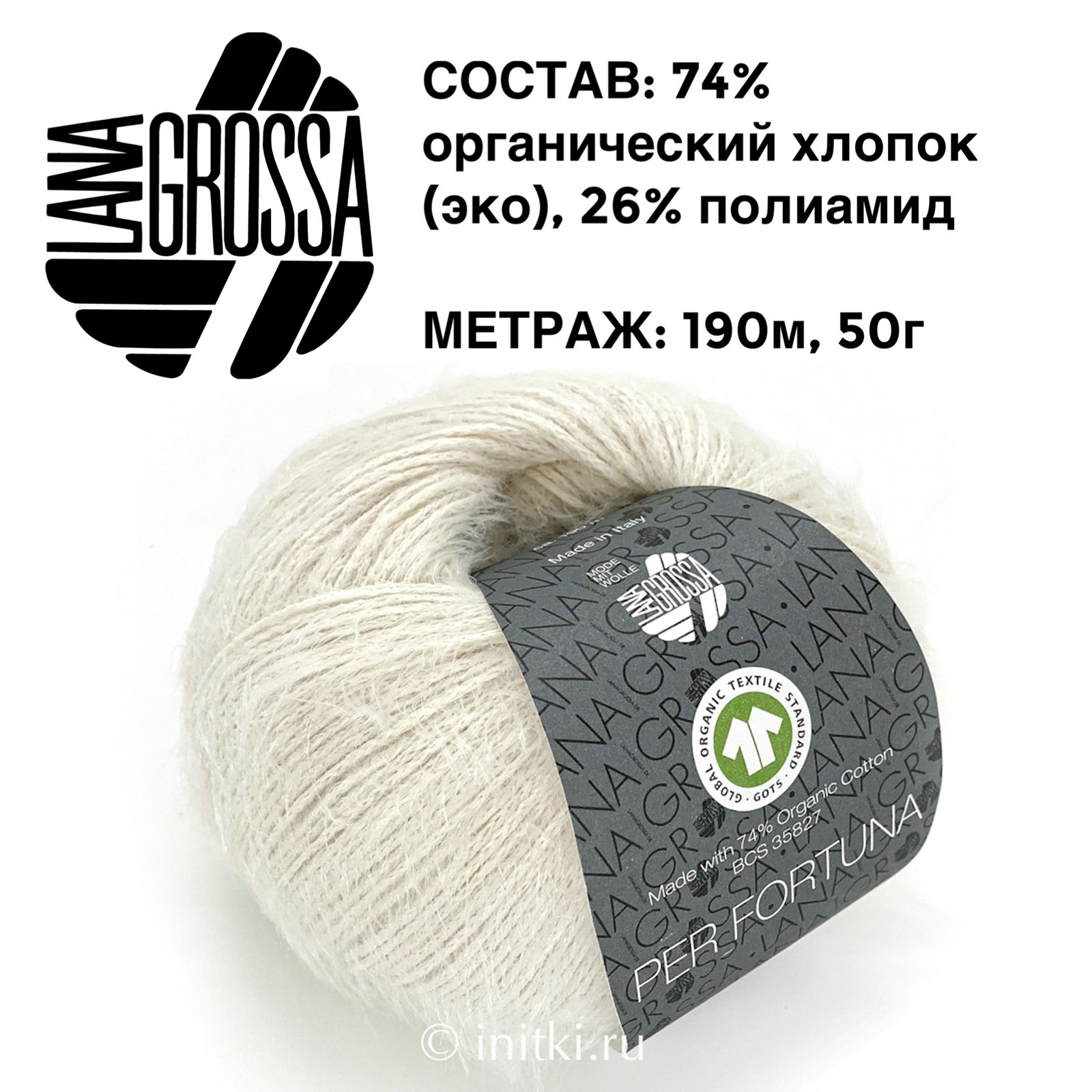 Lana Grossa PER FORTUNA 008 молочный Lana Grossa PER FORTUNA 008 молочный, Состав: 74% хлопок органический (эко), 26% полиамид Метраж: 190 метров в 50 граммах Видели ли вы когда-то пушистый хлопок? Нежный пушок в пряже PER FORTUNA после стирки становится настоящим ворсом. Он надежно закрепле