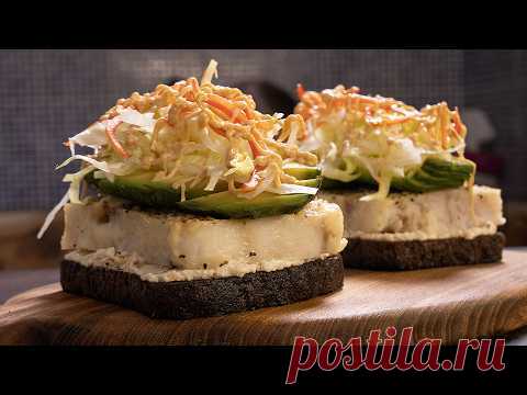 Ресторанное блюдо из доступных продуктов. Бутерброд с минтаем и авокадо