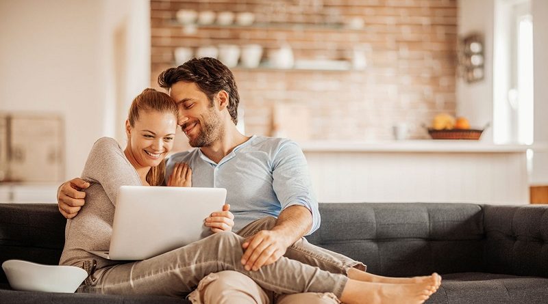 Пара сидит на диване и смотрит вместе на планшет. Они выглядят счастливыми и расслабленными, на фоне видна уютная кухня.