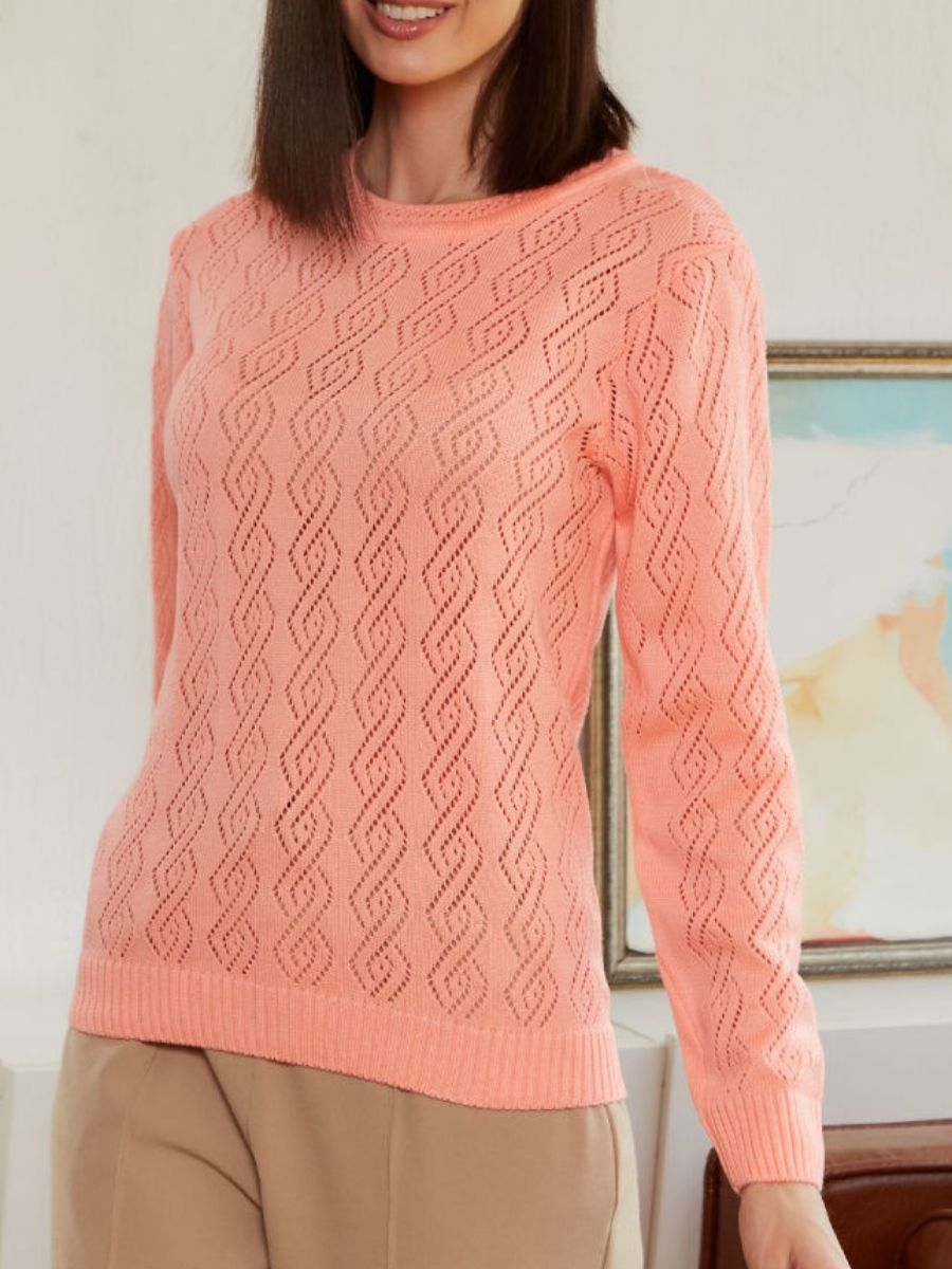 Классический джемпер теплого персикового цвета геометрическим вертикальным узором (схема узора)
