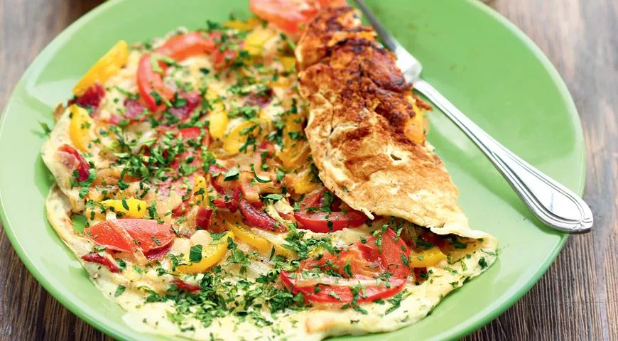 - Яйца взбить вилкой со сливками, солью и перцем. Влить в сковороду, готовить, сдвигая яичную массу с начинкой в тех местах, где яйца схватились. Когда яичница сверху еще немного влажная, посыпать ее петрушкой, снять с огня и накрыть крышкой. Подавать через 3 мин.