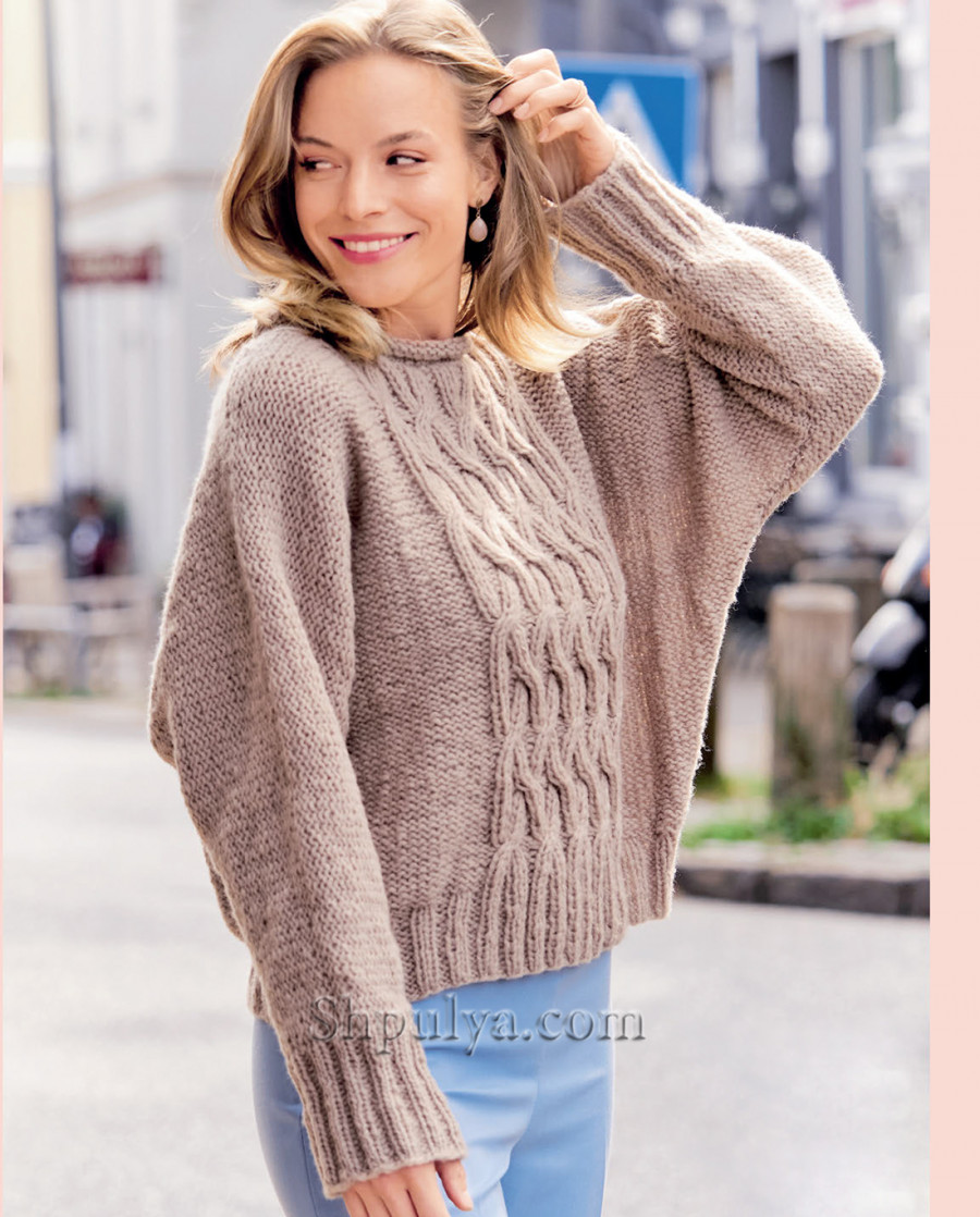 Удобный пуловер с цельновязаными рукавами «летучая мышь»выполнен из мягкой шерстяной пряжи и декорирован по переду и спинке узором из «кос».