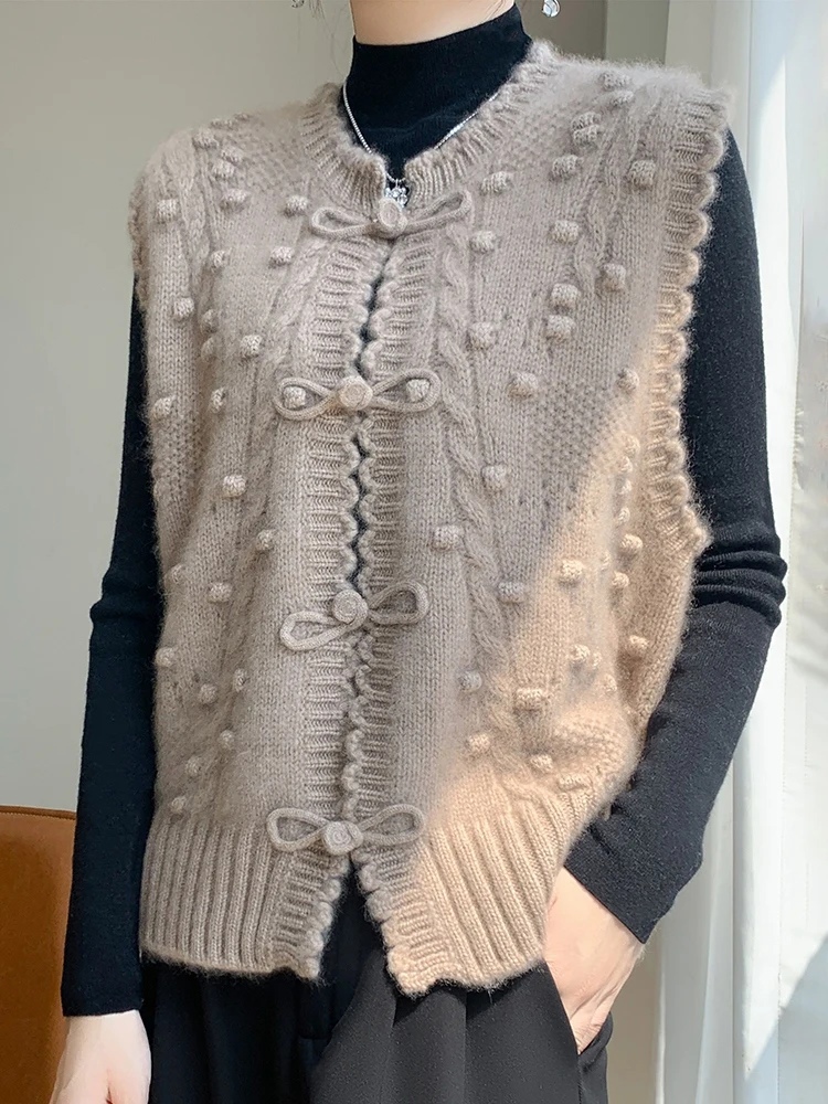Женственная безрукавка с вязаными пуговицами и навесными петлями (схема узора)