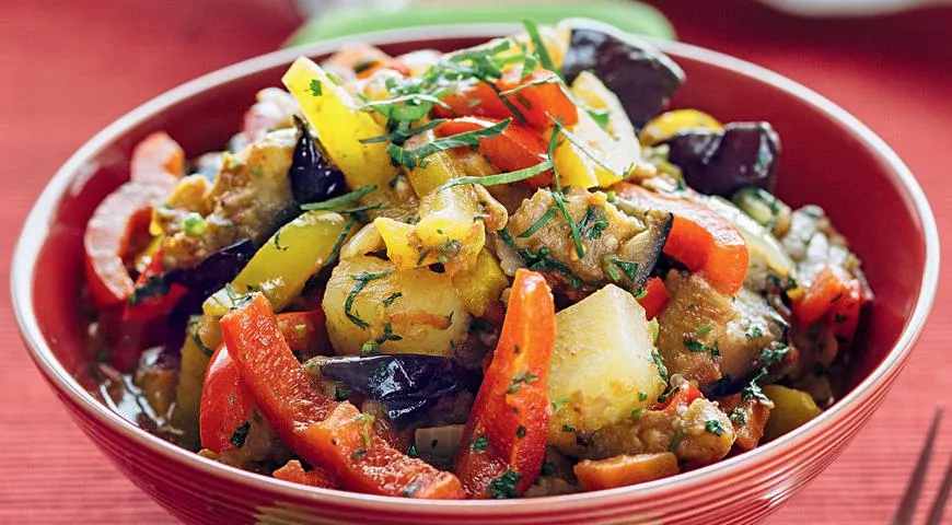 - Обжарьте в разогретом масле лук до золотистого цвета, 10 мин. Добавьте морковь, картошку и сладкий перец, жарьте все вместе на небольшом огне, помешивая, 15 мин. Переложите в кастрюлю к баклажанам.
