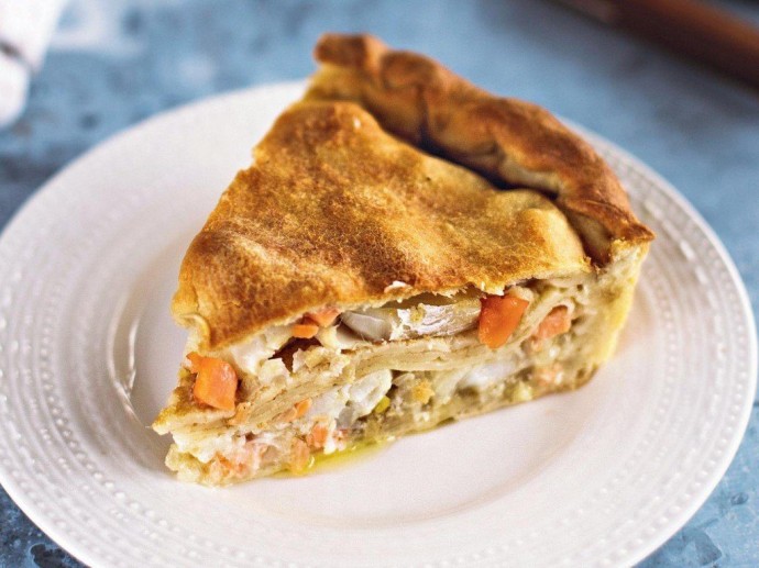На изображении виден кусок пирога на тарелке. Пирог выглядит золотистым и пропеченным, видны слои начинки, которая включает в себя мясо и овощи.