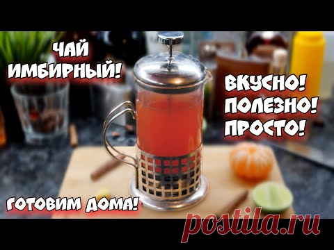 На изображении представлена кухонная сцена с френч-прессом, наполненным красноватым напитком, предположительно чаем. На переднем плане стоит деревянная разделочная доска, на которой визуализированы напиток в френч-прессе и половинка лайма. Фон сцены размыт, но можно заметить кухонные принадлежности и емкости для хранения продуктов. На изображении имеются тексты на русском языке, которые гласят: "ЧАЙ ИМБИРНЫЙ!", "ВКУСНО! ПОЛЕЗНО! ПРОСТО!", "ГОТОВИМ ДОМА!" и водяной знак "postila.ru".