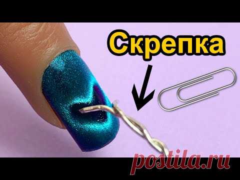 На изображении показан палец с нанесенным на ноготь синим блестящим лаком, к которому прикреплена скрепка. Слово "Скрепка" и стрелка указывают на скрепку. Фон изображения розовый, а внизу есть текст "posila.ru".