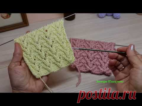 На изображении представлены человеческие руки, держащие два вязаных образца. Один образец зеленого цвета, другой - розового. Зеленый образец кажется немного больше и имеет текстуру, похожую на вафельный узор. В руках также видна вязальная спица. Фон изображения размыт, что позволяет сфокусировать внимание на вязаных изделиях.