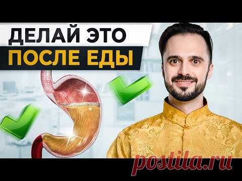 На изображении мужчина в жёлтом китайском стиле халате с рекламным сообщением, написанным в верхней части изображения: "ДЕЛАЙ ЭТО ПОСЛЕ ЕДЫ". Слева нарисована упрощённая диаграмма человеческого желудка с зелёными галочками, что предполагает положительный совет или действие, которое следует выполнять после еды.