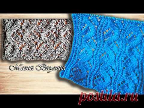 На изображении представлены два образца вязания: один с узором в виде косичек серого цвета и другой с узором из синих волн и отверстий. Внизу на изображении есть текст "Mano Eleganta" и "postila.ru", что может указывать на источник или авторство рукоделия.