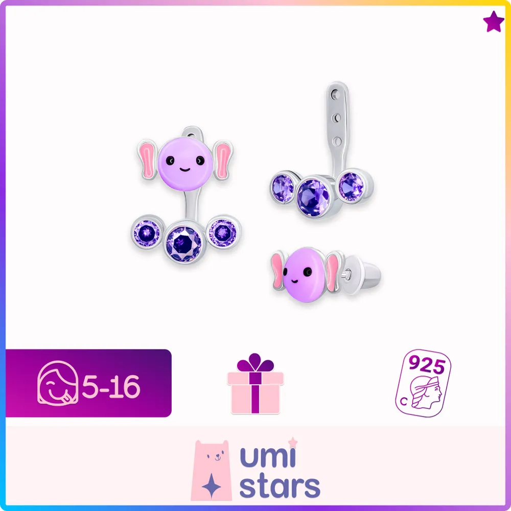 Детский ювелирный набор из серебра, включающий серьги и кулон с изображением милого розового слоника и камнями фиолетового цвета, представленный на фоне с веб-сайтом umipostila.ru, рекомендованный для возрастной группы 5-16 лет, с указанием серебра пробы 925.