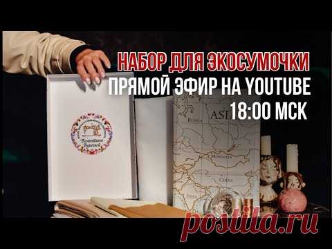 На изображении представлен набор для эксмошки, включающий в себя книгу с гербом, листы с картами и другие предметы. В верхней части изображения есть текст, объявляющий прямой эфир на YouTube в 18:00 по МСК на каком-то ресурсе.