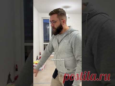 На фотографии изображен мужчина в сером свитере и очках. Он стоит в помещении, похожем на жилую квартиру. В кадре видны части мебели и размытая фигура человека в правой части изображения. Освещение в помещении искусственное.
