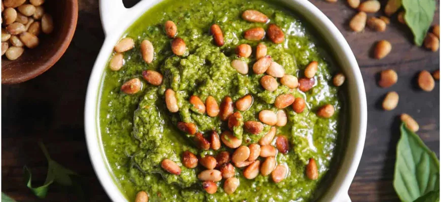 Зеленый соус песто в керамической миске, украшенный жареными кедровыми орешками. Вокруг на деревянной поверхности рассыпаны кедровые орешки.