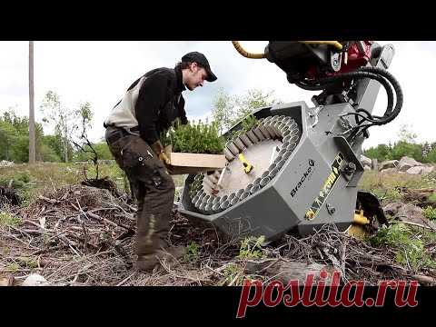 На изображении мужчина работает с крупной цепной пилой для распиливания дерева. Он находится на участке с недавно срубленными деревьями. Бренд на пиле не определяется. Вокруг обломки веток и небольшая растительность.