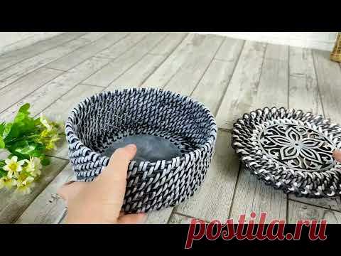 На изображении представлена ручная работа - корзинка, скрученная из тканевых полосок, окрашенных в черный и белый цвета, рядом с несложенной крышкой и искусственным цветком. Она лежит на деревянной поверхности.