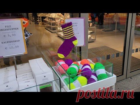 На фотографии изображен витринный стеллаж с яркими теннисными мячами и разноцветными носками на фоне магазина. Ценники с ценами на немецком языке указывают на то, что магазин может находиться в немецкоязычной стране.