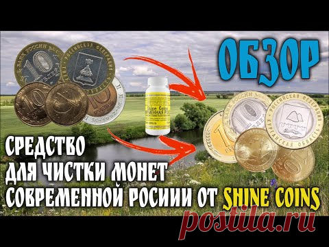 Изображение рекламного баннера с текстом на русском языке, на котором представлено средство для чистки монет современной России от компании SHINE COINS. На баннере изображены монеты разного достоинства и бутылочка с чистящим средством. В верхней части баннера крупными буквами написано "ОБЗОР".
