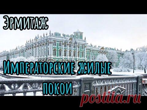 Фотография зимнего дворца Эрмитажа, заснеженные деревья и ограда на переднем плане, с надписями "ЭРМИТАЖ" и "ИМПЕРАТОРСКИЕ ЖИЛЫЕ ПОКОИ" на русском языке, указывающими на местоположение и назначение здания.