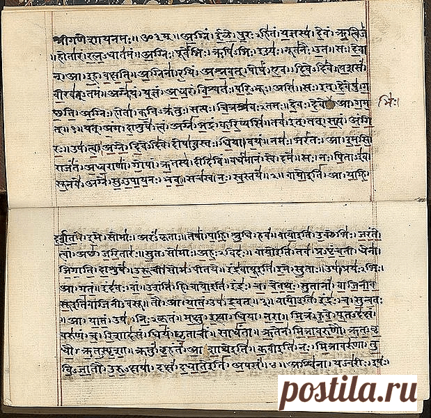 Открытая книга с текстом, написанным на санскрите или одном из языков Южной Азии на двух страницах с рукописным текстом. Почерк показывает черты традиционного письма, и текст разделен на аккуратные строки.