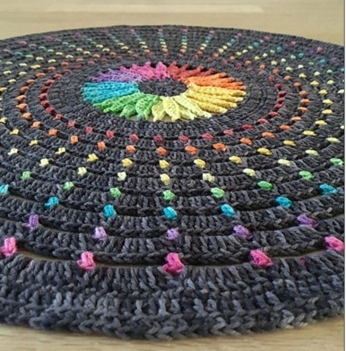 На изображении представлен круглый вязаный коврик. Он имеет центральную часть с радужными цветами и внешние кольца выполнены в темно-сером цвете. Отдельные цветные узоры и элементы видны по всей поверхности коврика.