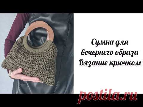 На изображении женщина держит вязаную сумку. Сумка кажется среднего размера и имеет деревянные ручки. На заднем фоне присутствуют текстовые надписи на русском языке, указывающие на то, что сумка предназначена для вечернего образа и сделана своими руками крючком.