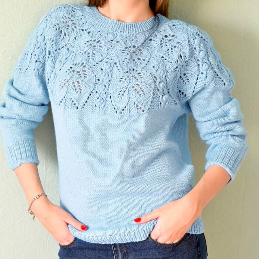 На изображении женщина в светло-голубом вязаном свитере с узором в виде листьев. Невозможно увидеть её лицо, так как оно находится вне кадра. Женщина носит джинсы и у неё красный маникюр.