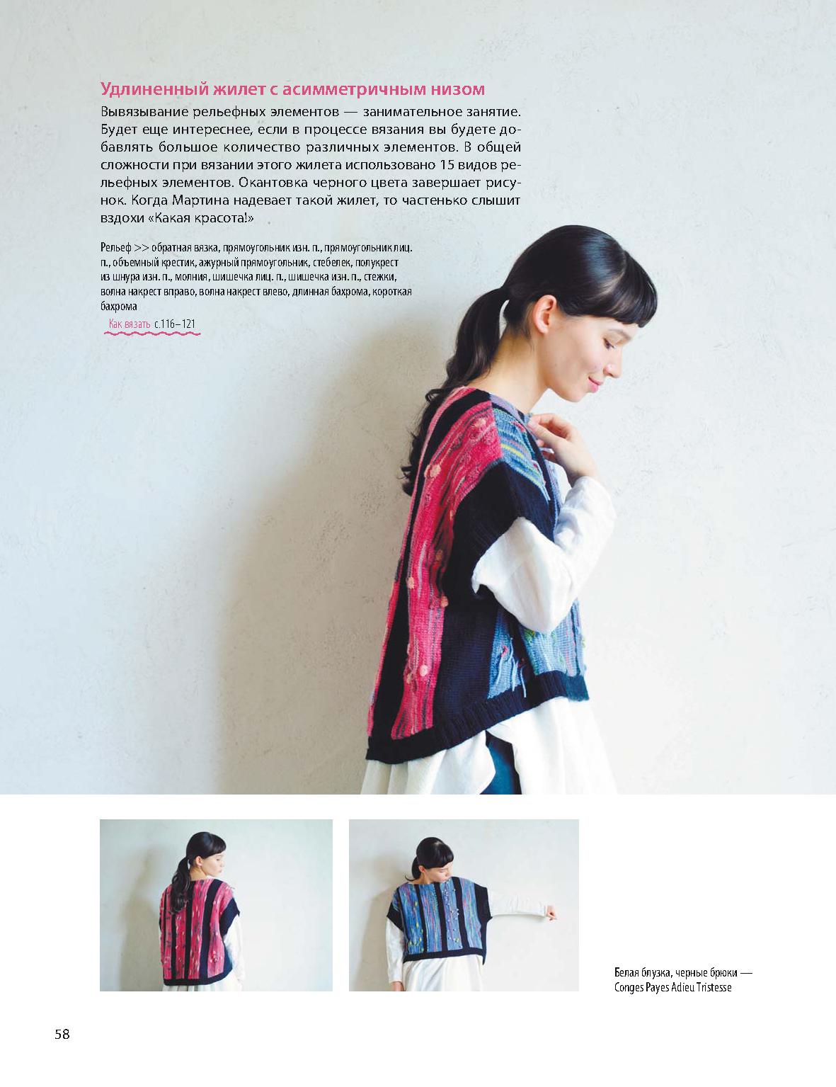 Женщина в уникальном вязаном жилете с асимметричным дизайном позирует для фотографии. Страница, по-видимому, из журнала мод, который показывает несколько изображений с различными ракурсами этого же жилета. Текст на странице на русском языке, возможно содержит описание вязаного элемента или инструкции.