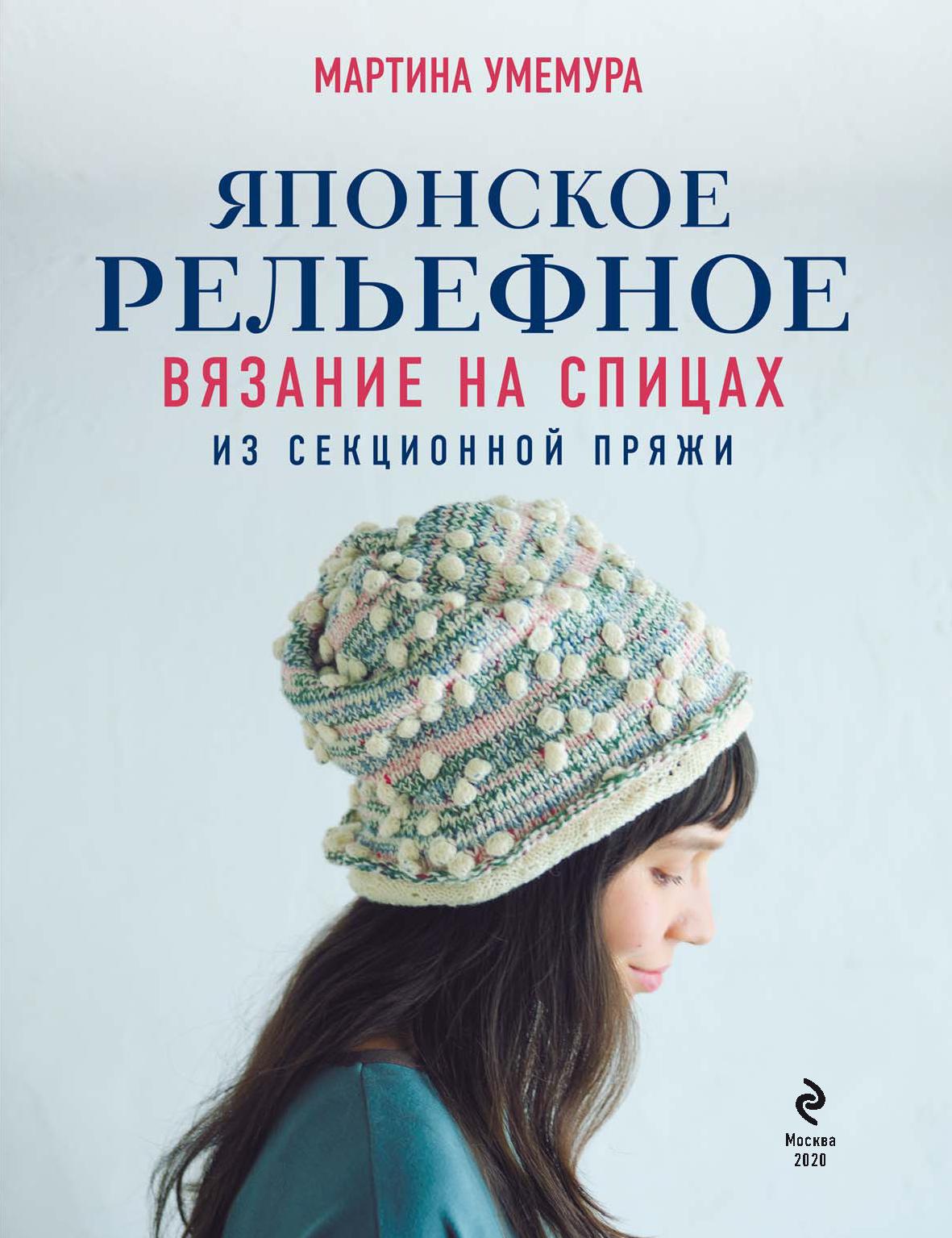 Обложка книги с изображением женщины в вязаной шапке. На обложке написано "Японское рельефное вязание на спицах из секционной пряжи, Мартина Уметумра".