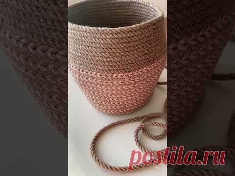 На изображении видны вязаные корзины различного размера, скорее всего сделанные из толстой пряжи или веревки. Они выглядят аккуратными и могут использоваться для хранения различных вещей в доме.