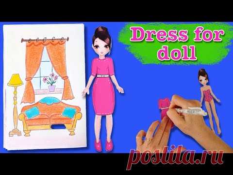 Изображение, показывающее куклу и процесс подготовки одежды для нее. На одной части картинки руки делают платье, а рядом картинка салона с мебелью и занавесками.