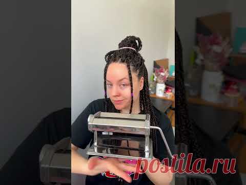 Женщина с косичками держит машину для изготовления макарон. Она находится в комнате с видимыми предметами вокруг, такими как упаковочные материалы, и смотрит в камеру с улыбкой.