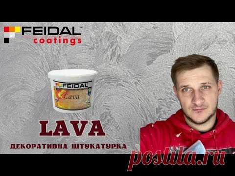 На изображении мужчина в красном свитере, справа от него изображение ведра с декоративной штукатуркой марки FEIDAL с названием "Lava". Фон изображения имитирует текстуру такой штукатурки. Вверху расположен логотип FEIDAL coatings.