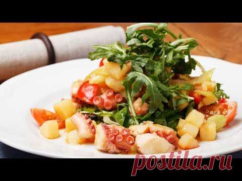 На изображении показано блюдо, которое выглядит как салат из свежих овощей, ароматных трав и морепродуктов. Видно, что в составе есть кусочки помидора, возможно, картофеля или другого овоща, а также кольца кальмара или осьминога. Блюдо украшено зеленью, возможно, это руккола.