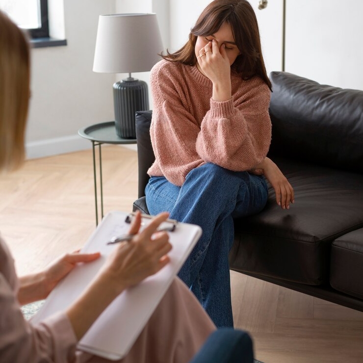 На изображении женщина, сидящая на диване с рукой у лица, выглядящая обеспокоенной или расстроенной. Напротив нее сидит другой человек, который держит в руках блокнот и ручку, возможно, это сеанс терапии или консультация.