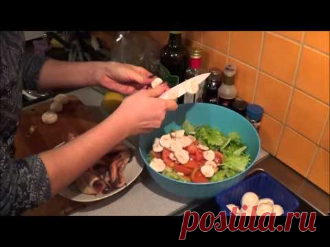 Человек нарезает овощи для салата на кухне. На столе видны салатные листья, помидоры, грибы и другие ингредиенты.