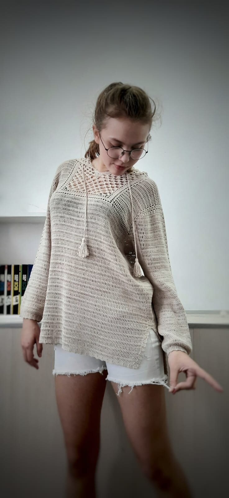 Женщина в очках, свободном вязаном свитере и рваных джинсовых шортах позирует, опустив взгляд вниз.