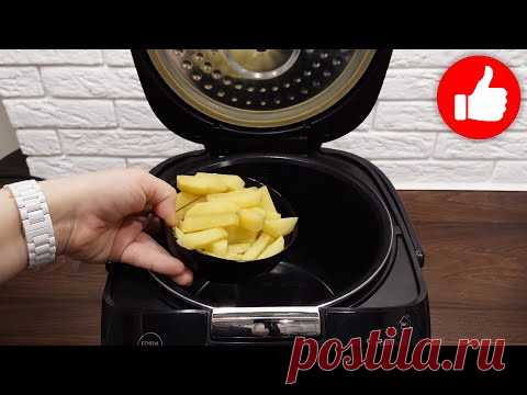 На изображении человек кладет нарезанный картофель в электрическую фритюрницу без масла. На заднем плане видна стена с имитацией кирпичной кладки.