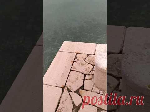 На изображении видна часть поверхности с треснувшей плиткой рядом с водой. Это может быть край водоема, такого как пруд, озеро, или бассейн, где плитка подверглась повреждению.