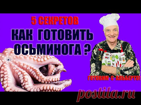 На изображении представлен человек в костюме с рисунками пищевых продуктов и в шеф-поварской шапке. Он улыбается и сложил руки на груди. Справа от него изображен крупный план осьминога. Фон ярко-фиолетовый, и на нем надписи на русском языке: "5 секретов как готовить осьминога?" и "Готовим с альберто" внизу, а также домен "posita.ru".