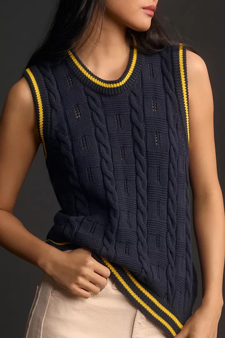 На изображении женщина в темно-синем вязаном жилете с желтыми кантами. Жилет имеет узор в виде кос. Женщина стоит на сером фоне и держит руку у края светлой юбки или брюк.