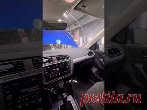 Внутренний вид автомобиля с обзором передней панели и включенной мультимедийной системой. Видно руль, дисплей на центральной консоли и часть переднего сиденья. За окном видно, что машина находится в тоннеле или автомойке.