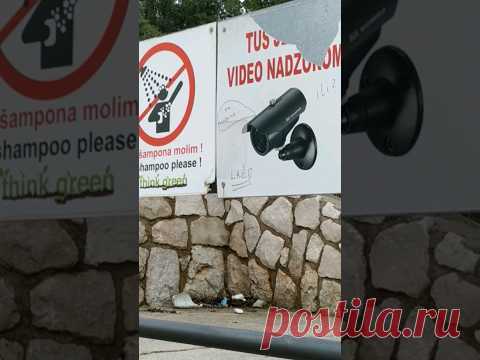 На изображении представлен коллаж из нескольких фотографий, включая знаки с предупреждением о запрете на использование шампуня и видеонаблюдения. Также видна часть каменной стены.