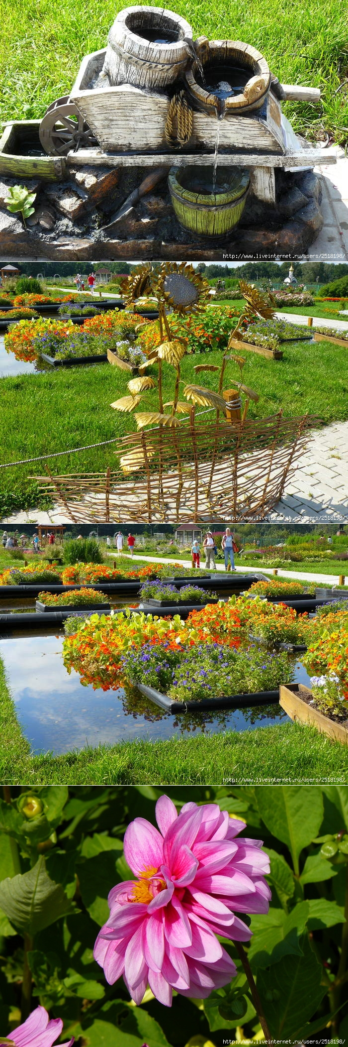 Изображения разных элементов сада: в верхней части фотография декоративного искусственного водопада, сделанного из бочек и колеса. В середине - вид на сад с красиво оформленными клумбами, зеркальными водоемами и скульптурой подсолнухов из металла. Нижний снимок показывает крупный план розового цветка, вероятно, георгина.