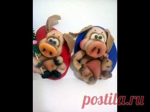 На изображении представлены две фигурки собак, выполненные из полимерной глины или подобного материала. Одна собака носит красную шапку, другая - синюю. Обе фигурки декорированы и могут быть использованы как украшение или игрушка.